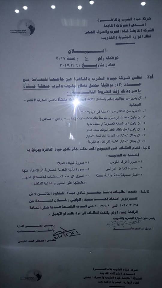 اعلان توظيف بشركة مياه الشرب والصرف الصحى بالقاهره الكبرى منشور فى 22/2/2017