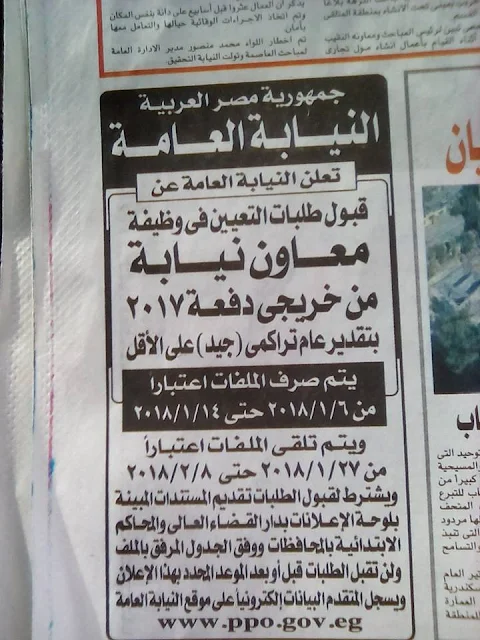 تعلن النيابه العامه عن قبول طلبات التعيين فى وظيفة معاون نيابة من خريجى كليات الحقوق والشريعه والقانون والشرطة دفعة 2017 بتقدير عام جيد على الاقل على الا يزيد سن المتقدم عن 30عام وذلك طبقا للشروط المبينه بلوحة الاعلانات بدار القضاء العالى وبمقار نيابات الاستئناف والنيابات الكلية والجدول المرفق بالملف ويطلب الملف من الموظف المختص بمكتب تعيينات اعضاء النيابة بدار القضاء العالى اعتبارا من يوم السبت الموافق 6/1/2018 وحتى يوم الاحد 14/1/2018 وذلك مقابل سداد مبلف 500 جنيه بخزينة مكتب التعيينات