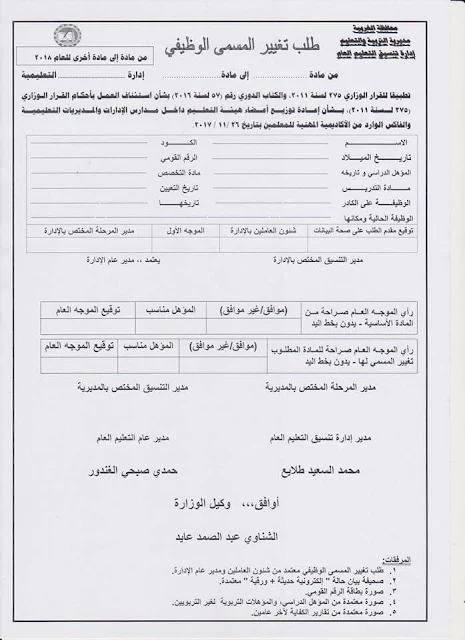 تطبيقا للقرار الوزارى لسنة 2011 والكتاب الدورى لسنة 2016 بشان استئناف العمل باحكام القرار الوزارى الخاص بتغيير المسمى الوظيفى والفاكس الوارد من الاكاديمية المهنية للمعلمين