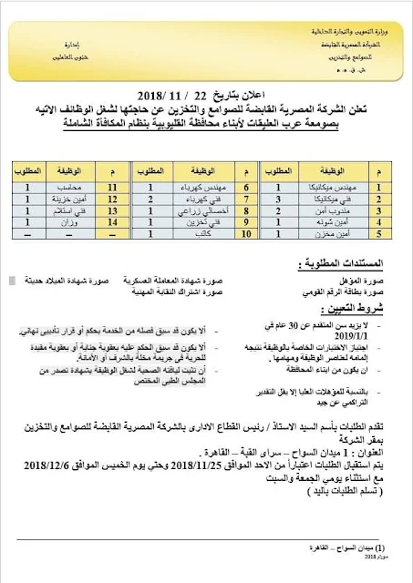 اعلنت وزارة التموين عن حاجة الشركة المصرية القابضة للصوامع والتخزين لعدد من الوظائف بالقاهرة الجيزة والاسكندرية والدقهلية والقليوبية