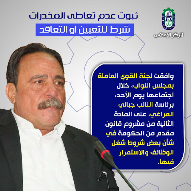 اعلنت لجنة القوى العاملة بمجلس النواب برئاسة النائب جبالى المراغى موافقتها على مشروع قانون مقدم من الحكومة فى شان بعض شروط شغل الوظائف والاستمرار فيها والتي تشترط للتعييَن أو التعاقد أو الاستمرار في الوظائف العامة ثبوت عدم تعاطي المخدرات.