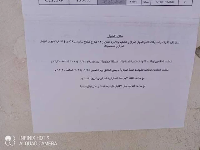 تعلن الهيئة القومية لسكك مصر عن جدول مواعيد إختبارات السادة المتقدمين لمسابقة الإعلان رقم 1 ، 2 لسنة 2021 من السادة المهندسين وحملة الشهادات الفنية وذلك بمقر ( مركز تقييم القدرات والمسابقات التابع للجهاز المركزي للتنظيم والإدارة ) الكائن في 13 ش صلاح سالم مدينة نصر – القاهرة بجوار الجهاز المركزي للمحاسبات بداية من 16 / 10 / 2021 والتفاصيل علي موقع البوابة الحكومة الإلكترونية http: jobs.gov.eg و / أو الرجوع إلي جهة التقديم إعتبارا من يوم 25 / 9/ 2021وتهيب الهيئة بضرورة حضور جميع المتقدمين في اليوم المحدد لكل وظيفة بكل منطقة وفقا للجدول المرفق