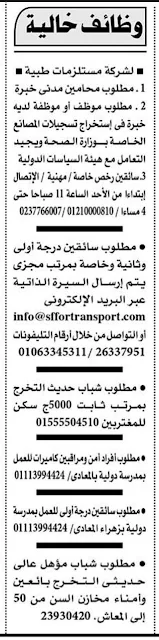 مطلوب مهندسين مبيعات و تسويق و أفراد و مشرفين أمن و مدير حسابات و مراجع حسابات و محامين نقض و إستئناف و مدير دار ايتام مقيم و موارد بشريه و سكرتارية و مدير جودة و مهندسين إنتاج و مدير صيانة و فنيين صيانة تبريد و كهرباء و ميكانيكا و مساعدين فنيين صيانة و مندوبين و مدرسين جميع التخصصات و IT و عمال نظافة و دبلوم صناعي حديث التخرج و فنى صيانه ماكينات نجاره و مكنجى و عمال زراعيين و إمناء مخازن و اخصائي اجتماعي و اخصائي نفسي