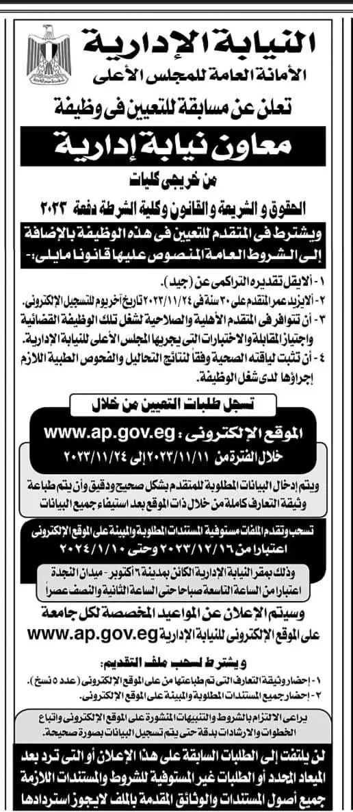 لخريجي الجامعات ..مسابقة تعيينات بالنيابة الادارية من خريجي كليات الحقوق والشريعة والقانون بتاريخ 10-11-2023